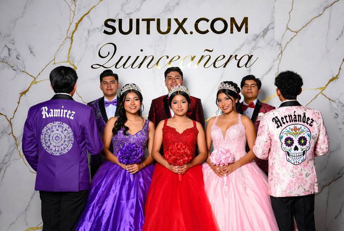 - Agregar patrones y detalles personalizados — ¡hazlo personal! Imagina esmóquines con los apellidos de todos los chambelanes bordados en la espalda, o motivos culturales como el calendario azteca, diseños del Día de los Muertos, o incluso las caras de miembros de la familia incorporadas en las chaquetas. Podemos mezclar colores escolares, elegancia negro sobre negro, o cualquier tema que honre tu herencia e historia.