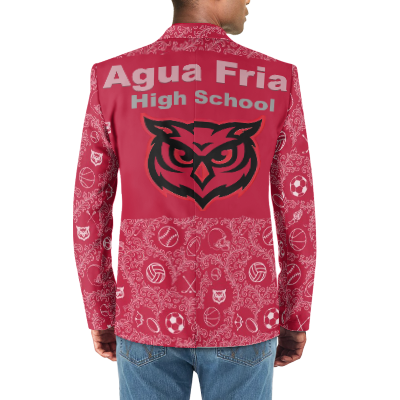 This is a fun Tuxedo Suit Blazer Coat made custom made with the Agua Fria High School on the back and in the pattern of the coat along with all the sports played to give the max school spirit with style. Great for prom or just to wear at any school events or sports games to show your school spirit.