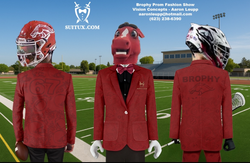 This is a fun Tuxedo Suit Blazer Coat made custom made with the Brophy Mascot on the back and in the pattern of the coat along with all the sports played to give the max school spirit with style. Great for prom or just to wear at any school events or sports games to show your school spirit.