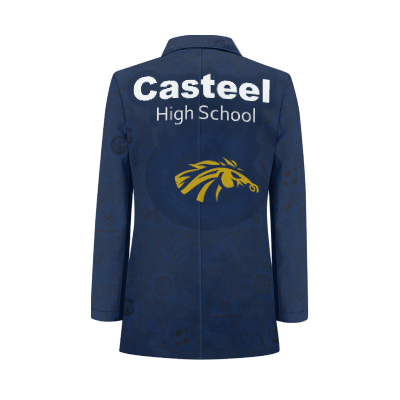 This is a fun Tuxedo Suit Blazer Coat made custom made with the Casteel High School on the back and in the pattern of the coat along with all the sports played to give the max school spirit with style. Great for prom or just to wear at any school events or sports games to show your school spirit.