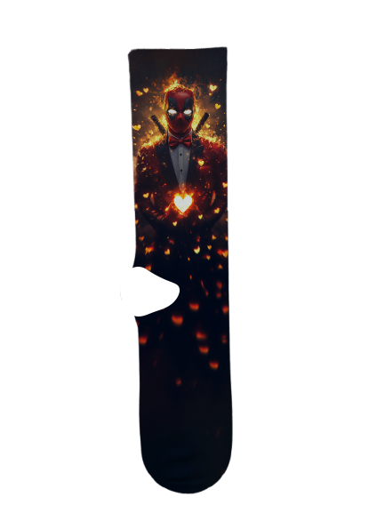 Deadpool Socks by Suitux, a wisecacking mercenary who gains accelerated healing powers and a disfigured body after a rogue experiment, leading him to become the anti-hero Deadpool, using his new abilities and dark humor to hunt down the scientist responsible and protect his loved ones, all while breaking the fourth wall.
