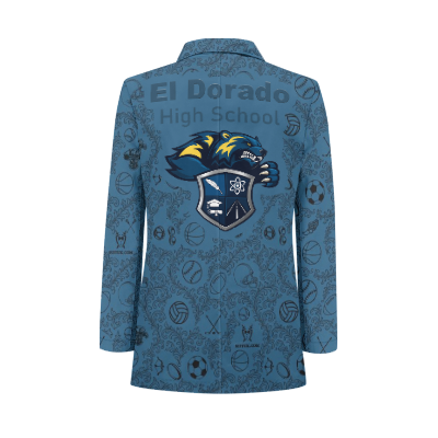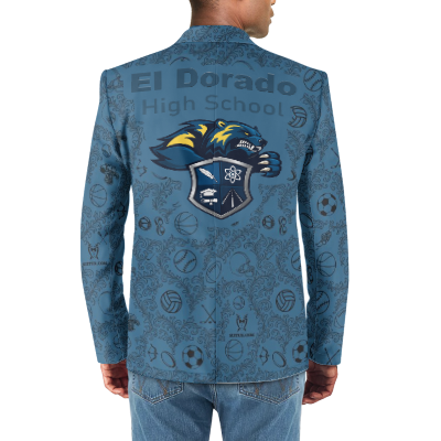 This is a fun Tuxedo Suit Blazer Coat made custom made with the El Dorado High School on the back and in the pattern of the coat along with all the sports played to give the max school spirit with style. Great for prom or just to wear at any school events or sports games to show your school spirit.