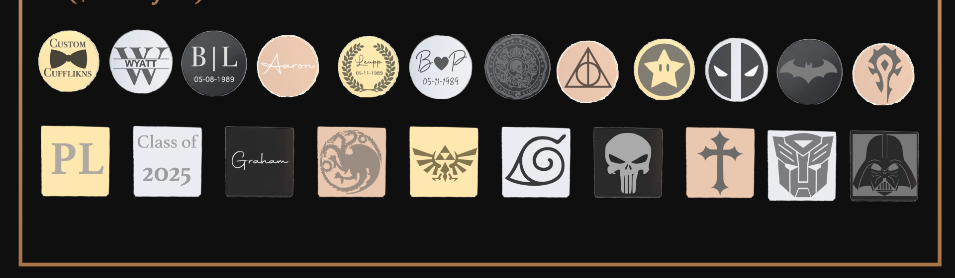 | Engraved Cuffs | Anime Ninja, Bat, Cross, Dragons, Robot Space, Secret Skull Coin, Skull, Space Mask, Star Power, Triangle, Triangle Magic, Vigilanti Funny, WoW |