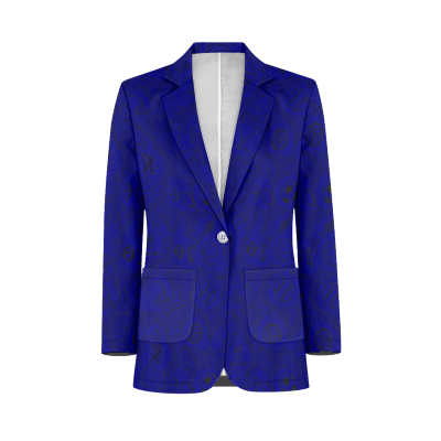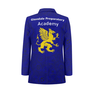 This is a fun Tuxedo Suit Blazer Coat made custom made with the Glendale Preparatory Academy on the back and in the pattern of the coat along with all the sports played to give the max school spirit with style. Great for prom or just to wear at any school events or sports games to show your school spirit.